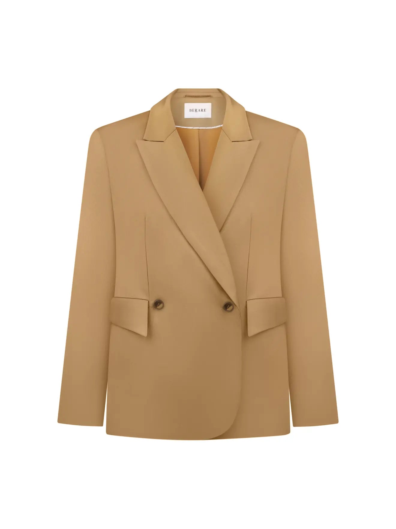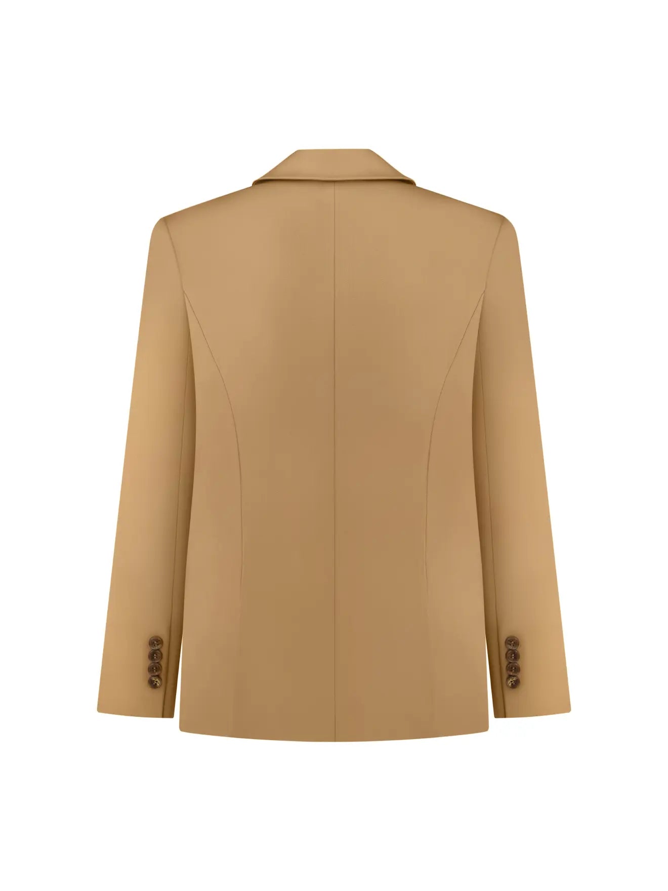 Двобортний жакет із прямою структурною лінією плеча, виготовлений зі 100% італійської шліфованої шерсті найвищої якості. Тканина кольору Pantone 18-0835 TPX Dried Tobacco, яка залежно від освітлення набуває легкого смарагдового відтінку.